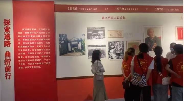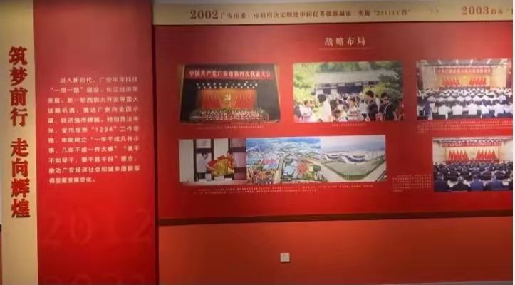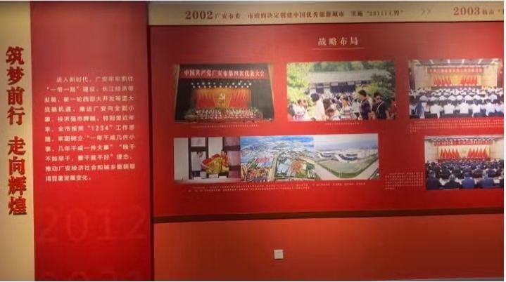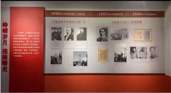 “建党百年.红色记忆——广安党史图片暨美术展”展厅主要分为“峥嵘岁月、迎接曙光(1921—1949)”“探索道路、曲折前行(1949-1978)”“改革开放、跨越发展(1978-2012)”“筑梦前行、走向辉煌(2012-现在)”四个板块,介绍了1926年6月广安市第一个县级临时支部成立以来,广安市党史上的重大事件、重大活动、重要人物以及广安市的经济社会发展历程。