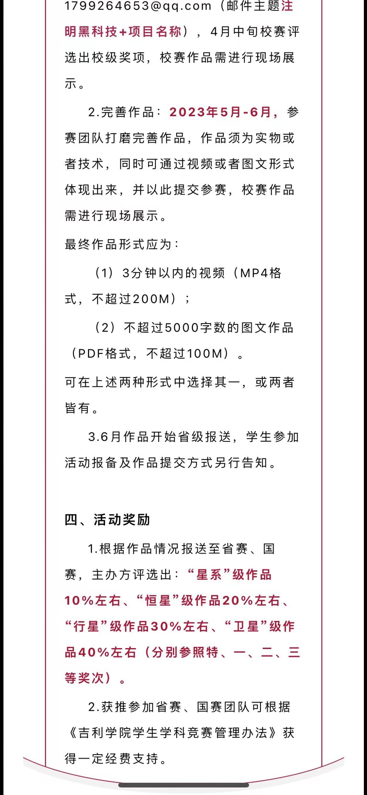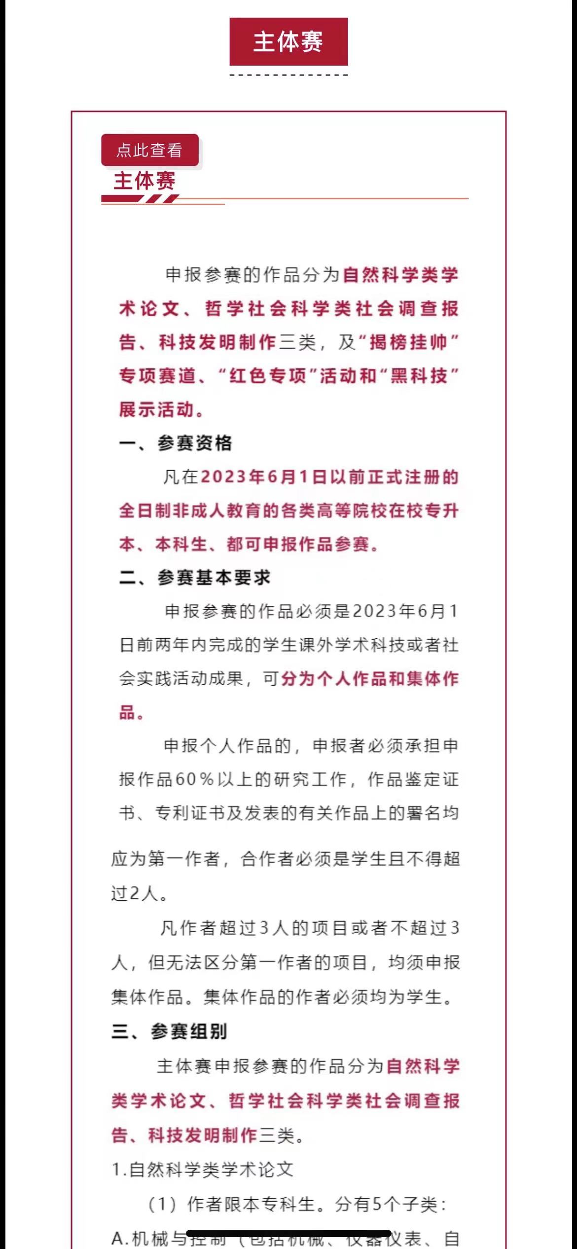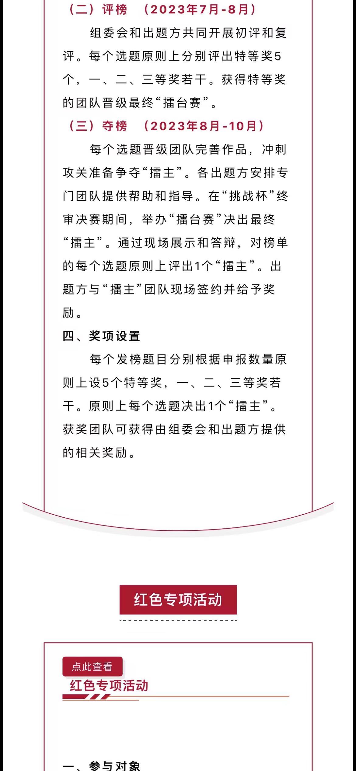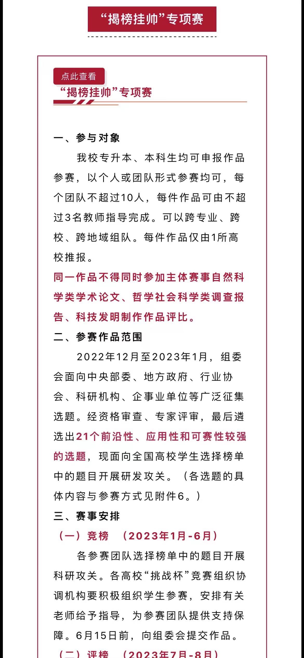 第十八届“挑战杯”全国大学生课外学术科技作品竞赛拟于2023年6月-11月举行,国赛由贵州大学承办。本届国赛设置1项主体赛:课外学术科技作品竞赛;1项专项赛:“揭榜挂帅”专项赛;2项配套活动:红色专项活动和黑科技专项活动。