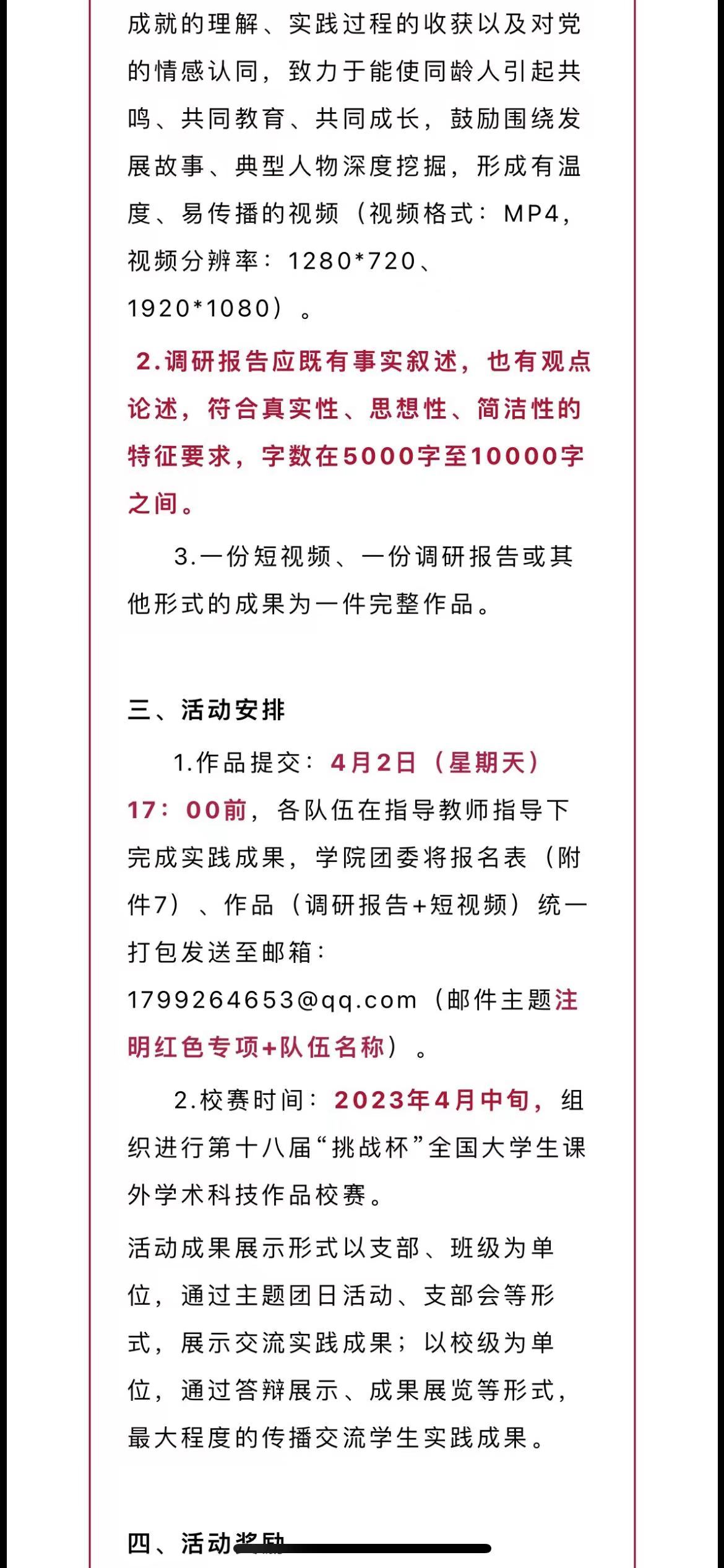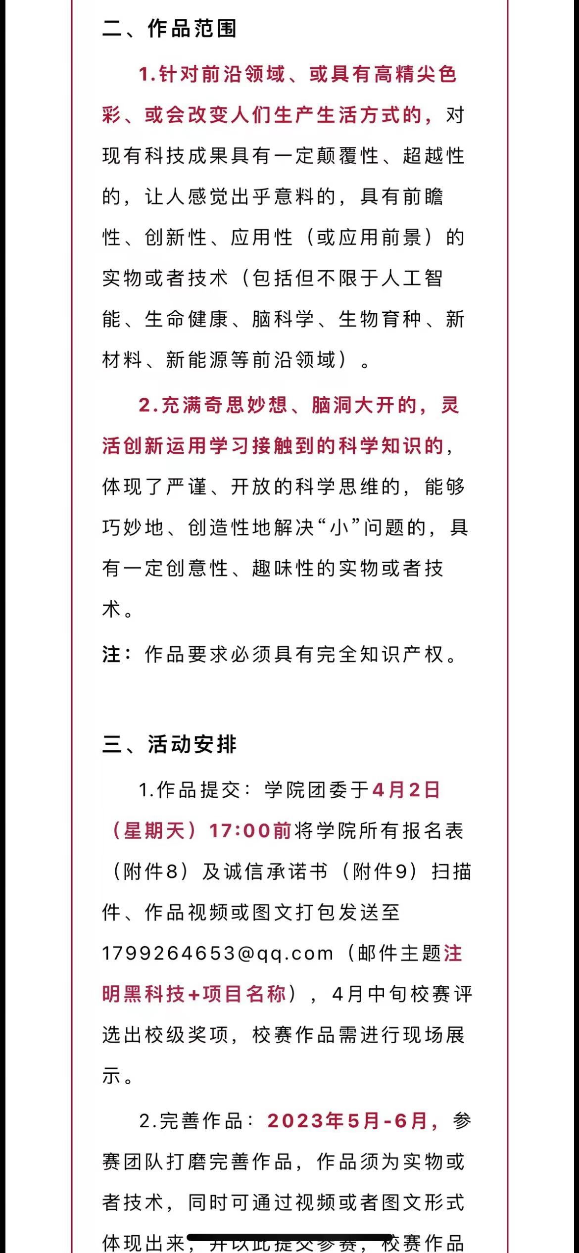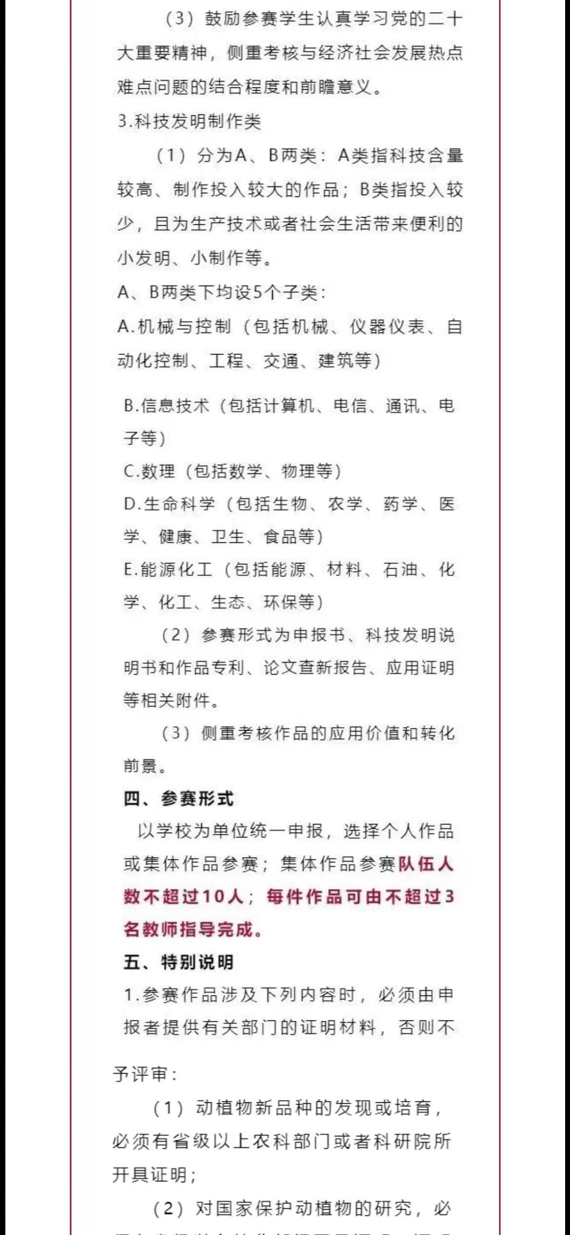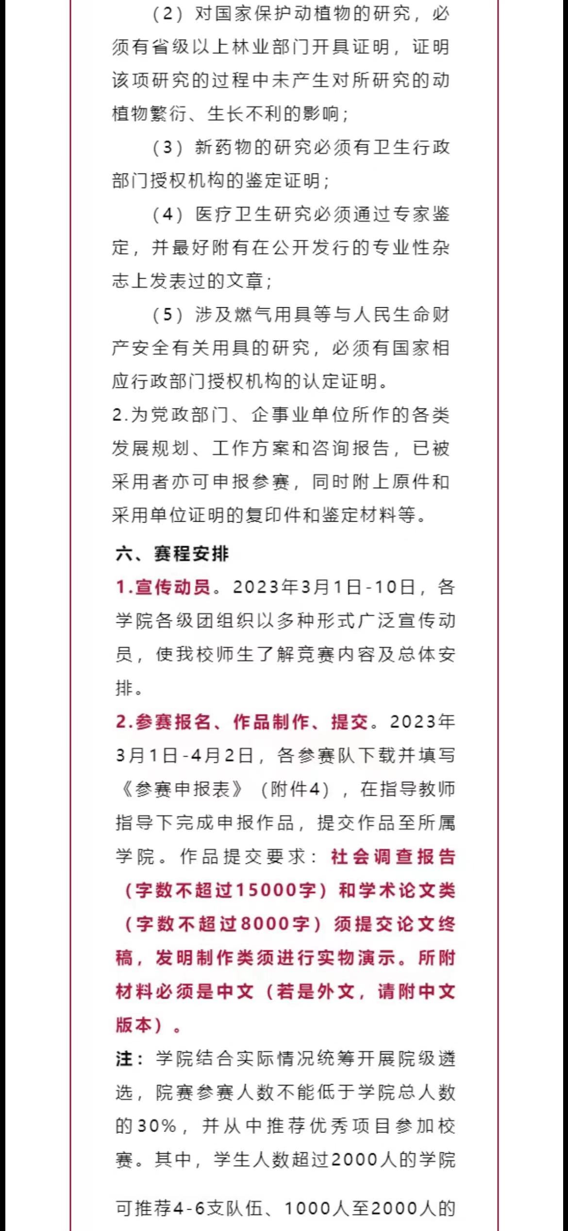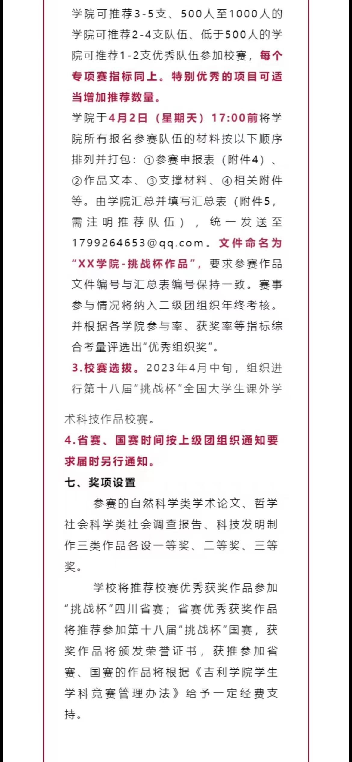 为深入学习贯彻党的二十大精神,进一步引导广大学生努力培养科学精神和科学态度,积极学习科学知识和科学方法,使广大学生提高创新意识,增强科研能力,营造校园科技创新文化氛围,不断发现、造就一批在学术科技上有潜力、有创造力的优秀人才,进一步发挥“挑战杯”竞赛的育人功能,促进我校学生课外学术科技活动的蓬勃开展,现将第十八届“挑战杯”全国大学生课外学术科技作品竞赛校级选拔赛有关事项通知如下: