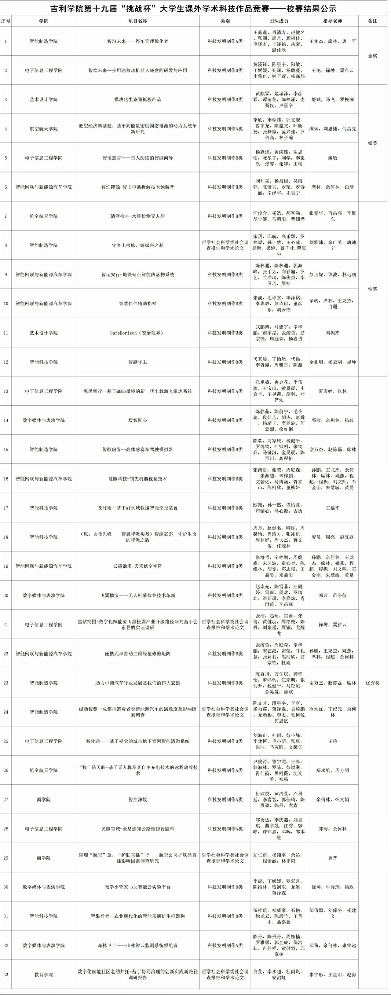 根据《吉利学院第十九届“挑战杯”四川省大学生课外学术科技作品竞赛校赛有关工作的通知》文件要求,本届校赛共收到各学院推荐作品205项。经资格审核、校级复赛、校级路演及决赛等多轮严格评审,依据竞赛规则,作品奖项设置为校级金奖、银奖、铜奖、优秀奖,其中金奖占总作品数的1%、银奖占2%、铜奖占3%,同时设立2个“优秀组织奖”。经评审,最终评选出金奖2个、银奖4个、铜奖6个;校赛排名前三的12支项目团队将代表吉利学院参加第十九届“挑战杯”四川省大学生课外学术科技作品竞赛。具体获奖名单如下: